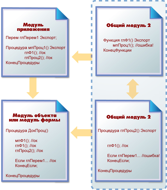 - В модулях прикладных объектов и модулях форм доступны экспортируемые переменные, процедуры и функции модуля приложения (модуля внешнего соединения), а также экспортируемые процедуры и функции общих модулей.