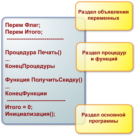 Любой программный модуль, за исключением общих модулей, состоит из следующих разделов: