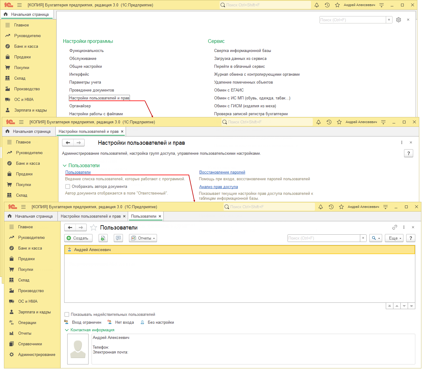 - Раздел: Администрирование – Настройки пользователей и прав.