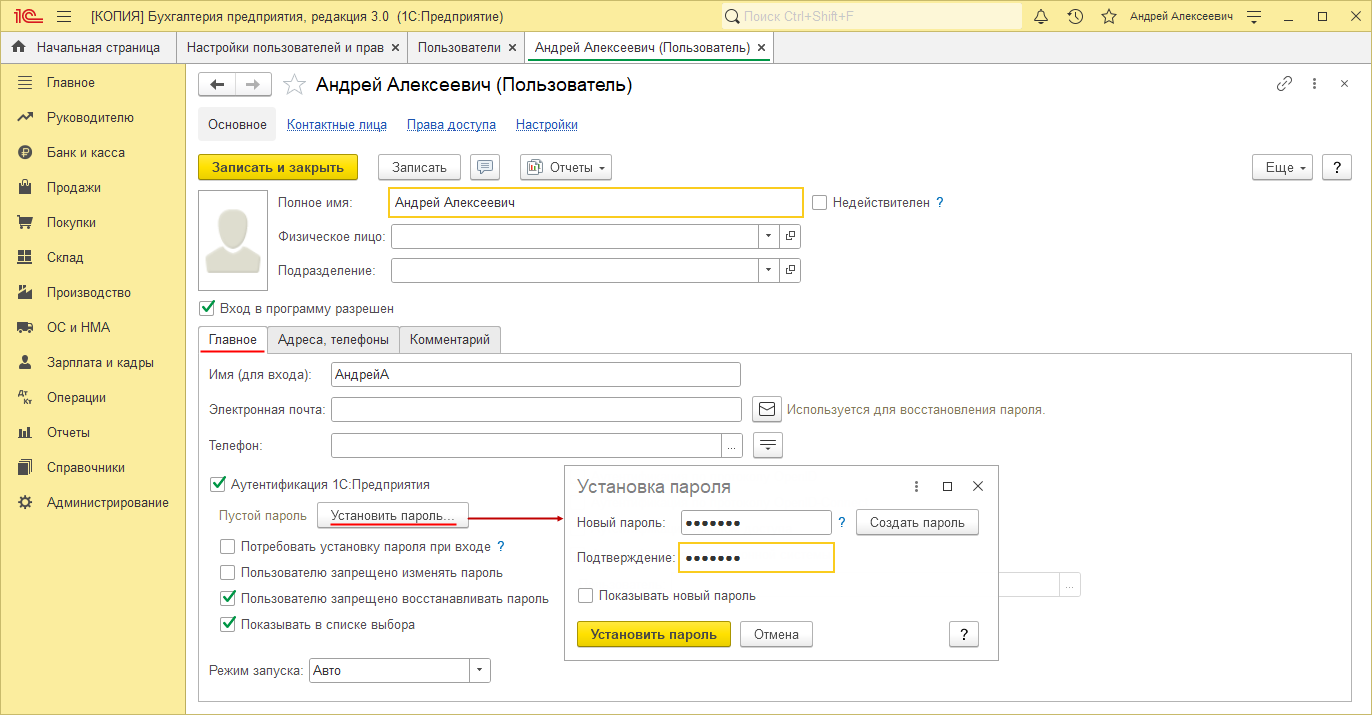- флажок «Потребовать установку пароля при входе» — пользователь должен изменить установленный ему пароль на свой при первом входе в программу (настройка возможна только при снятом флажке «Пользователю запрещено изменять пароль»);