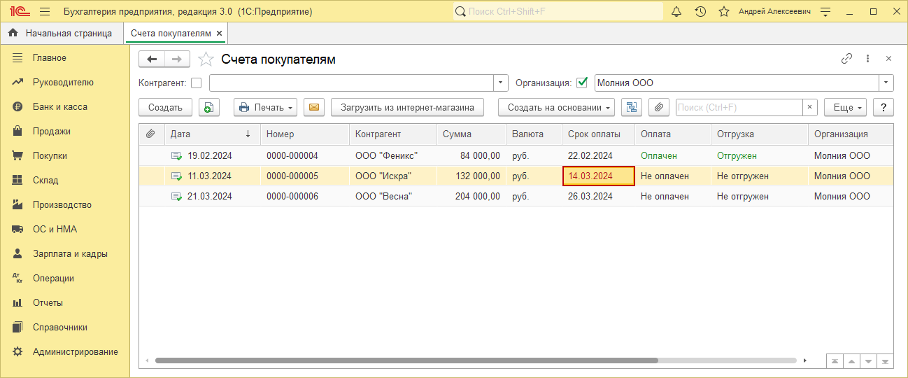 Проконтролировать оплату счетов, выставленных покупателям, и отследить счета с просроченной оплатой можно в списке документов «Счета покупателям».