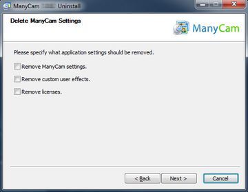 The uninstall dialogue will offer you to Remove ManyCam settings and Remove custom user effects. Leave these options unchecked if you would like to keep your settings and effects for future use.