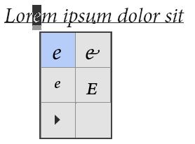 - Слоты глифов со сплошным черным прямоугольником в нижнем правом углу указывают на то, что для данного конкретного глифа имеются варианты. Эти варианты можно просмотреть во всплывающем меню. Чтобы открыть его, щелкните и удерживайте слот или щелкните его, удерживая клавишу Alt или Option. Перетащите указатель мыши на вариант глифа и отпустите его, чтобы вставить его в активный слой.